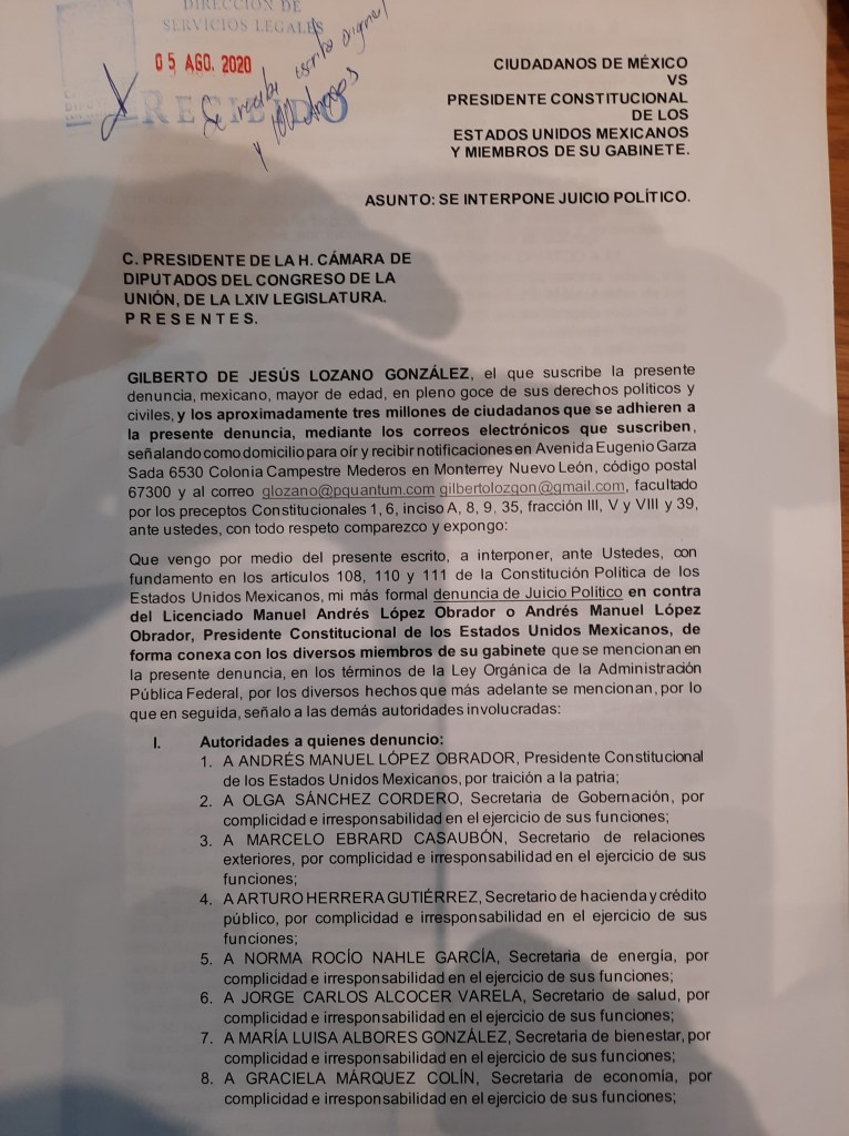 Manuel López Obrador y algunos miembros de su gabinete, denuncia que fue presentada ayer, miércoles 5 de agosto