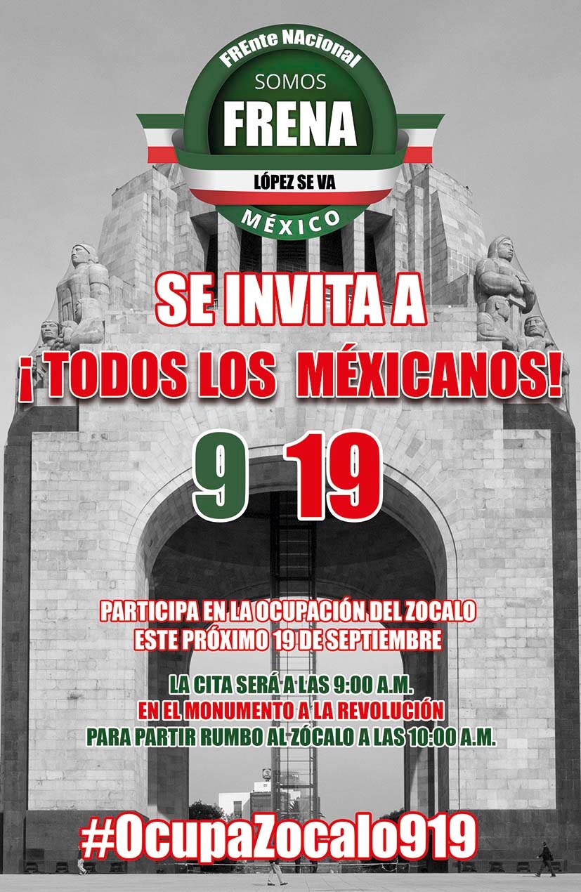 Sugiero que tomemos todas las puertas del Palacio Nacional este 19 de Septiembre y si no es esta vez, será después de estar instalados en el Zócalo. Después será bloquear todos los accesos del Zócalo. La forma que debemos seguir también es desquiciar también a las autoridades del Gobierno de la Cd. de México que también están en el Zócalo y no dejarlos operar. Vamos adelante hasta que renuncie «El Estiércol»