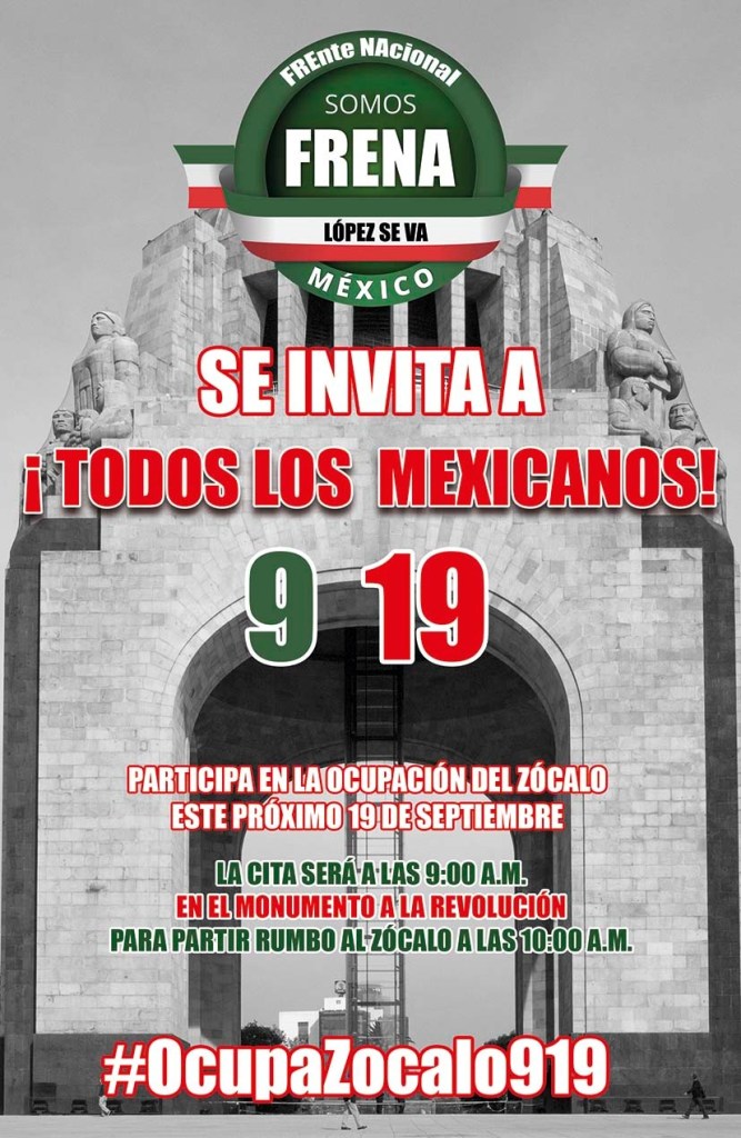 #SomosMexico y por nuestras familias tenemos el derecho y deber sagrado a levantar la VOZ y eso haremos el 19 de Septiembre partiendo del Monumento a la Revolución donde nos daremos cita a las 9:00 AM para partir como se hizo el pasado agosto 30 y ocupar de manera indefinida la Plaza de la Constitución (zocálo de CDMX), plaza pública de manera ordenada y en paz, pues somos los dueños de la misma.