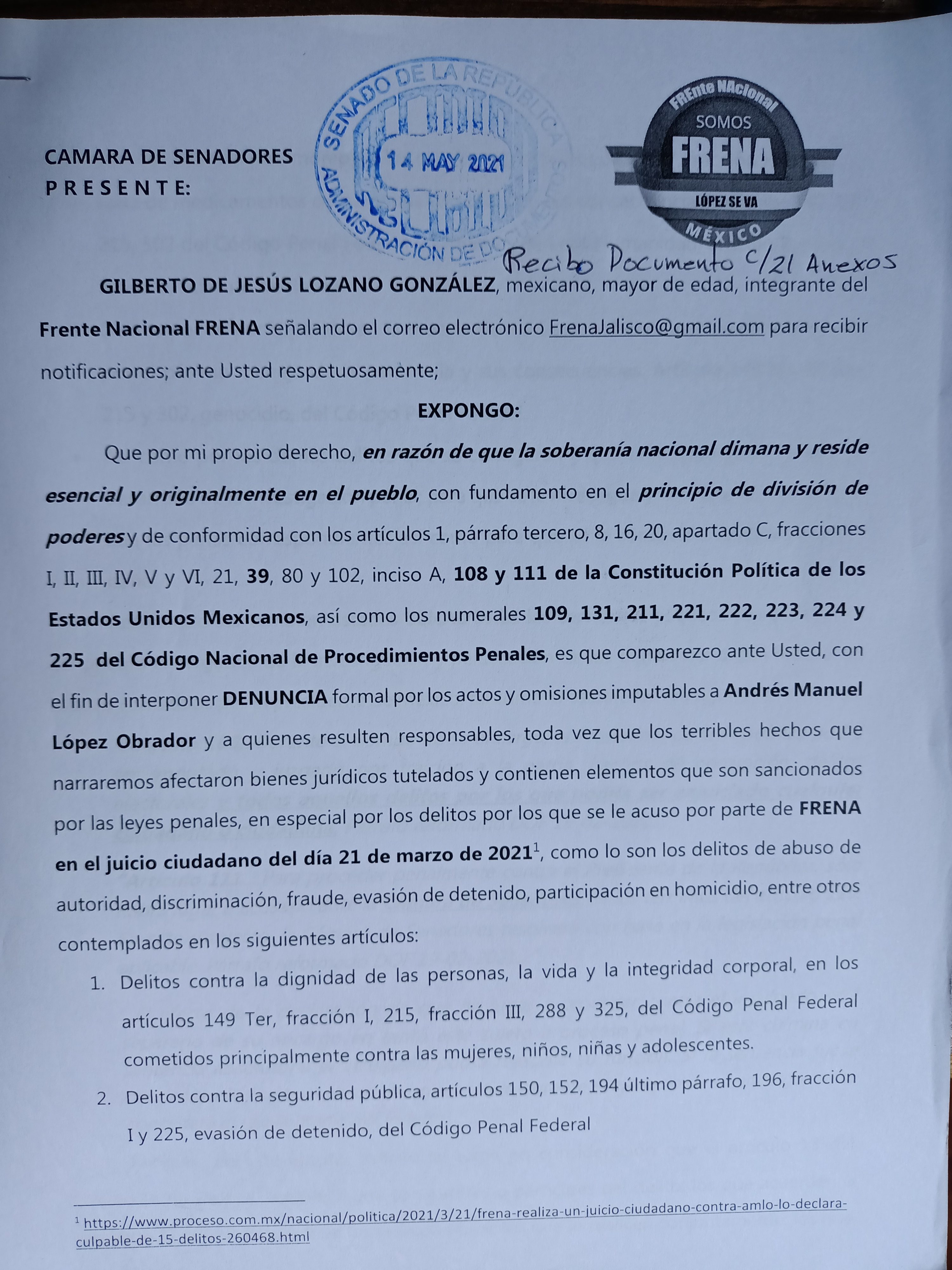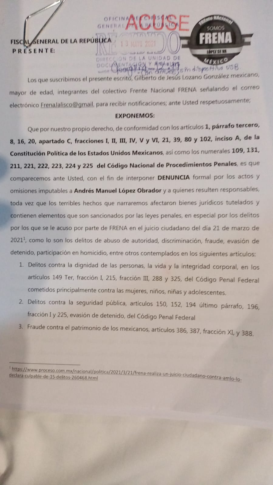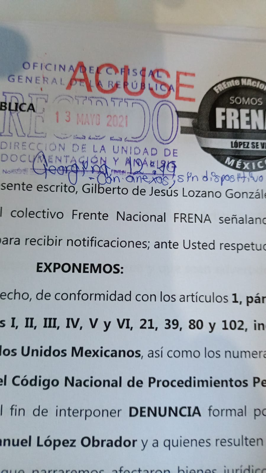 Dicha demanda PENAL fue recibida por la oficina del C. Fiscal General de la República; Alejandro Gertz el día de hoy mayo 13 del 2021
