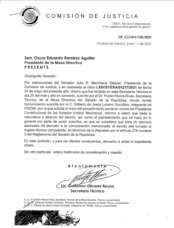 Comisión de Justicia del Senado pide al Presidente de la Mesa Directiva; Senador Eduardo Ramírez inicie procedimiento en el órgano técnico correspondiente.