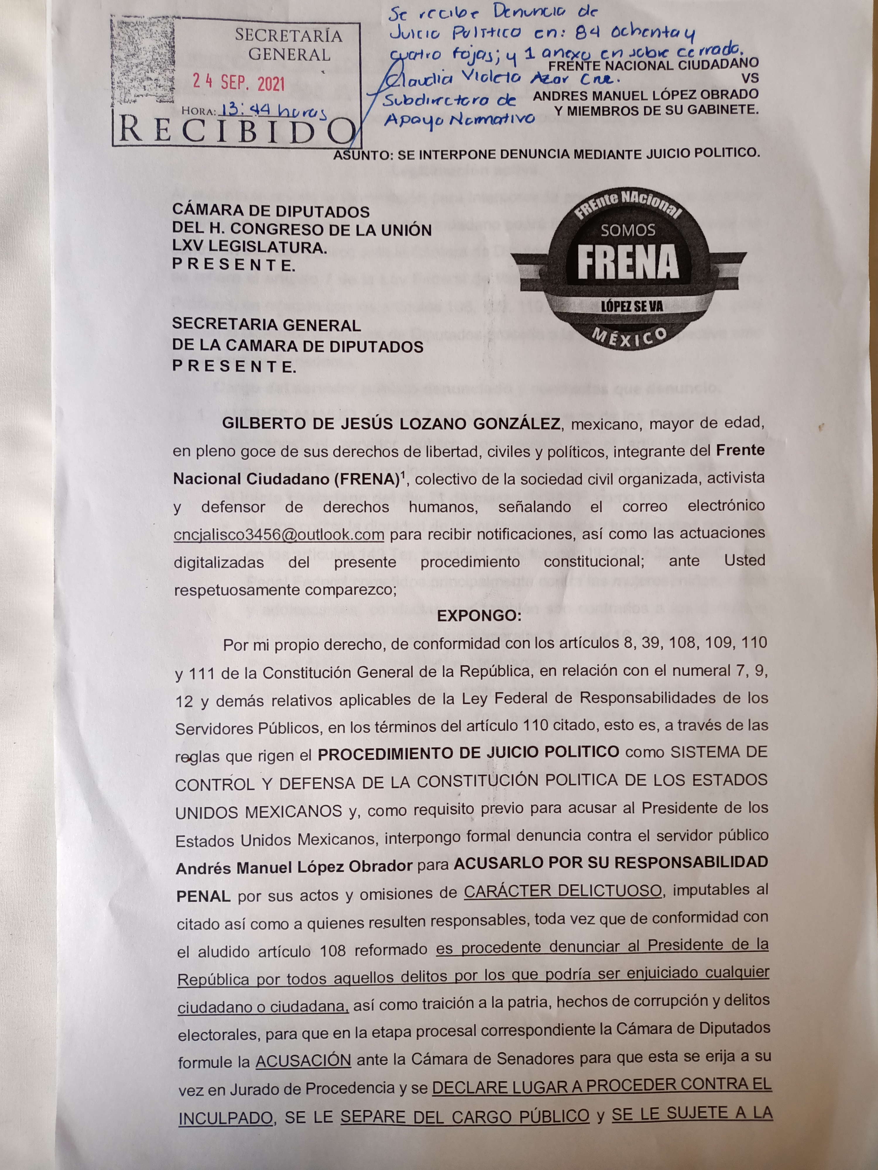 El día de ayer 24 de septiembre se presentó denuncia contra el mandatario en la Dirección Jurídica de la Cámara de Diputados, órgano oficial de recepción de estas denuncias.