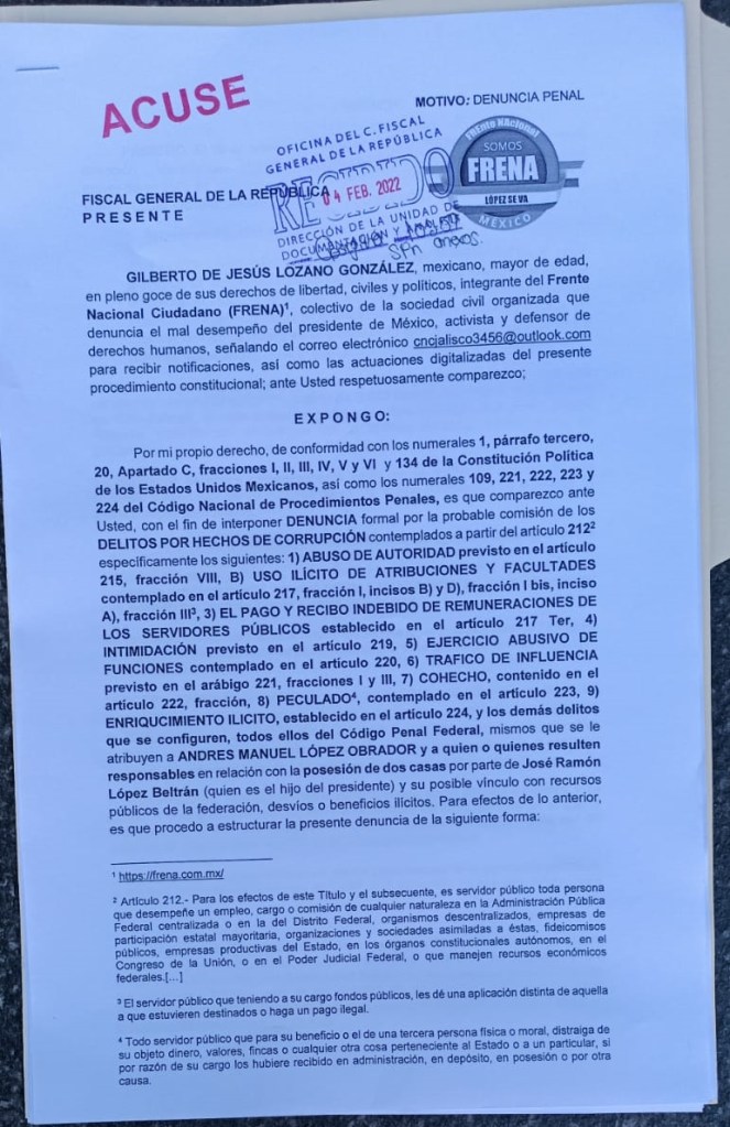 Se hace Denuncia ante la Fiscalía General de la República por los hechos que implican al C. Andrés Manuel López Obrador y su hijo, José Ramón López Beltrán por los sobornos vía el uso de dos casas de lujo en Houston, sin pago de renta, a un ejecutivo de la Empresa Backer-Hughes que recibe contrato millonario de PEMEX.
