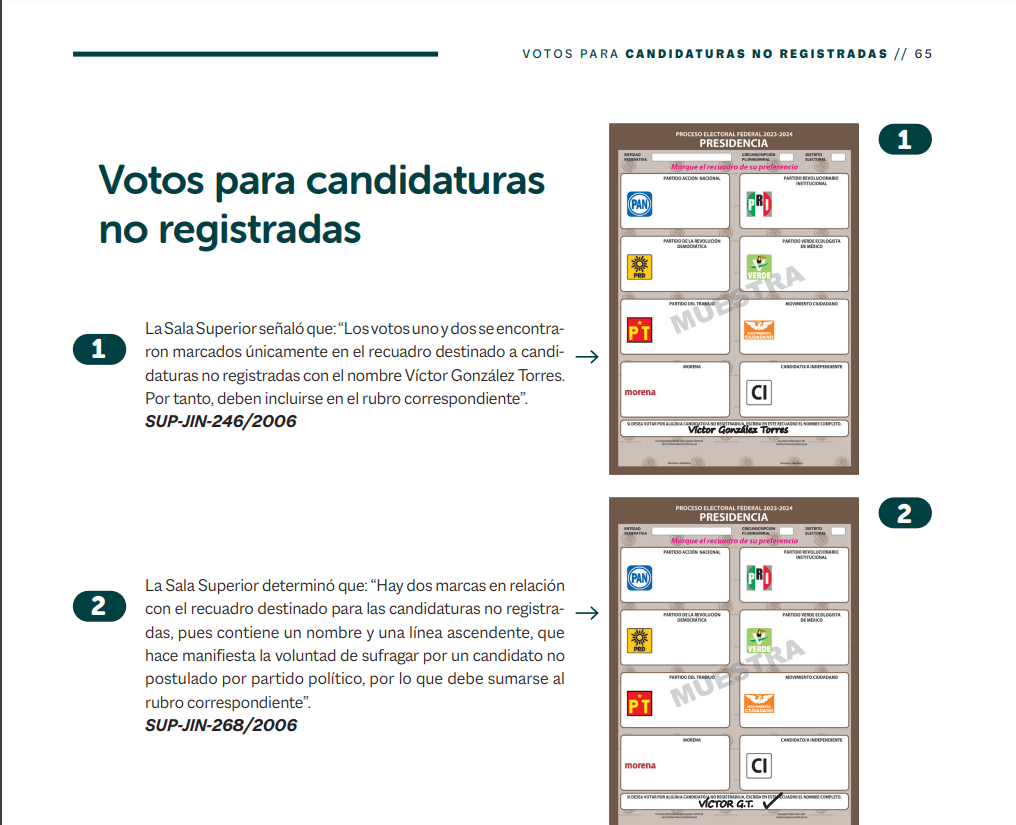 En su página 65 NO DEJA DUDAS, los votos por candidato NO REGISTRADO cuentan y se SUMAN.